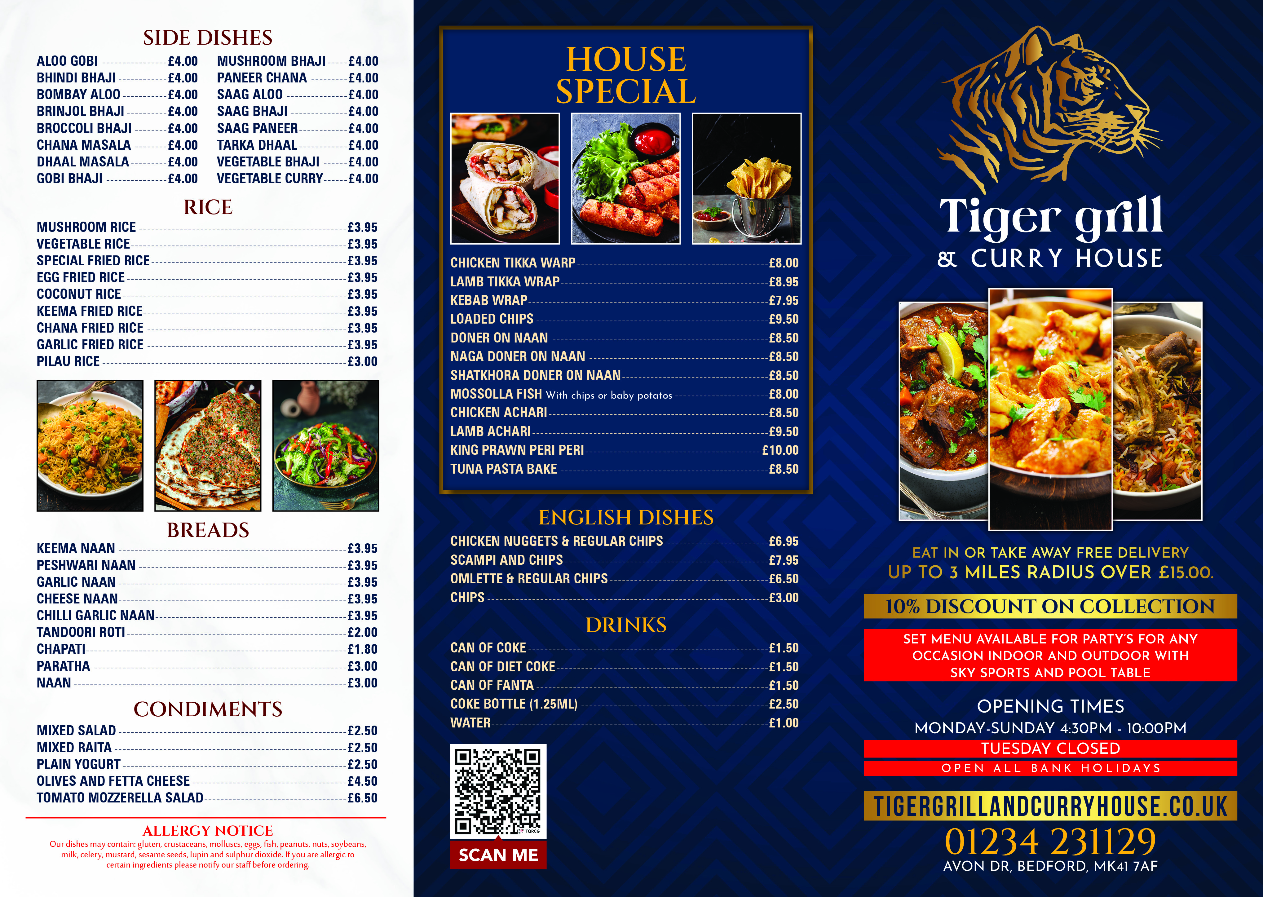 Enjoy delicious Indian cuisine from the comfort of your home or indulge in an unforgettable dining experience amidst the enchanting ambience of TIGER GRILL & CURRY HOUSE.